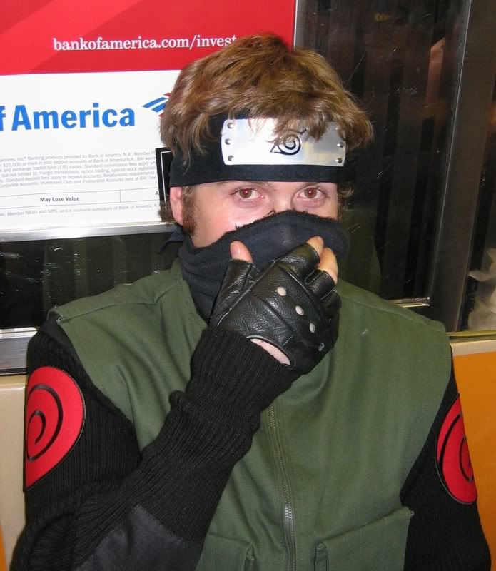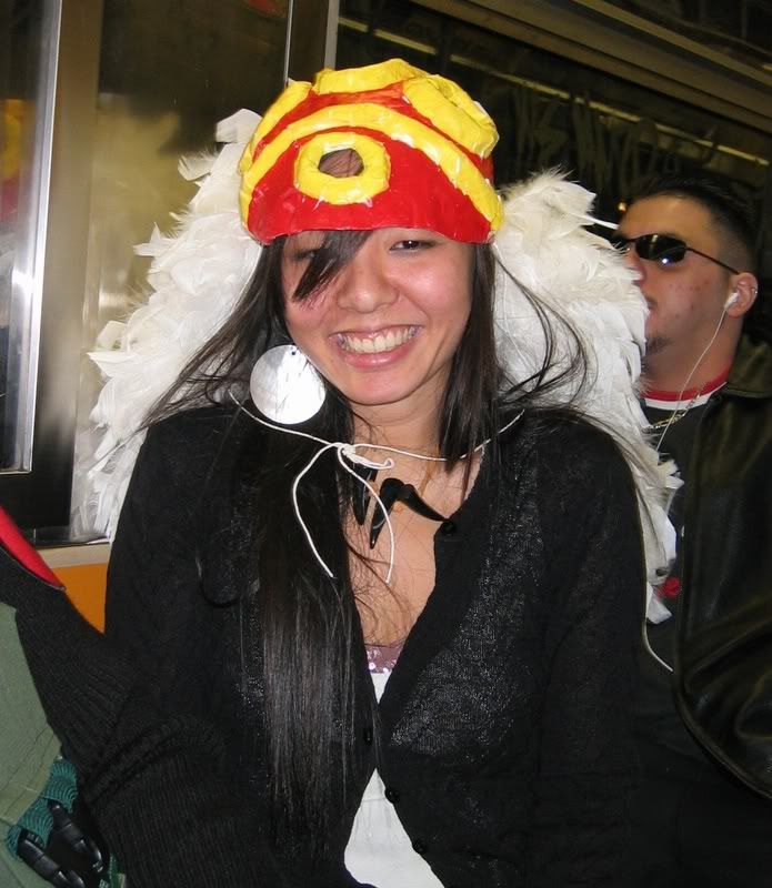 I actually won a prize in the raffle! It's a Darth Maul pewter figure. Mario offered to trade me a Todd McFarlane toy for it, but I only accepted a trade if he'd fork over the V for Vendetta mask he won on top of his first win. He wouldn't, but he was a good sport and let me snap this cheeky picture. It wasn't the last photo op of the evening, either. I couldn't resist going up to some perfect strangers on the subway home because the girl had a great Mononoke mask. She did a great job with it, as it was obviously hand-made. I loved it to pieces. And, not to be rude, I took a picture of her boyfriend dressed as some Naruto character. They asked me if I knew Naruto and I confessed I didn't but that Princess Mononoke was like my favorite Miyazaki film, so I couldn't not take a picture.